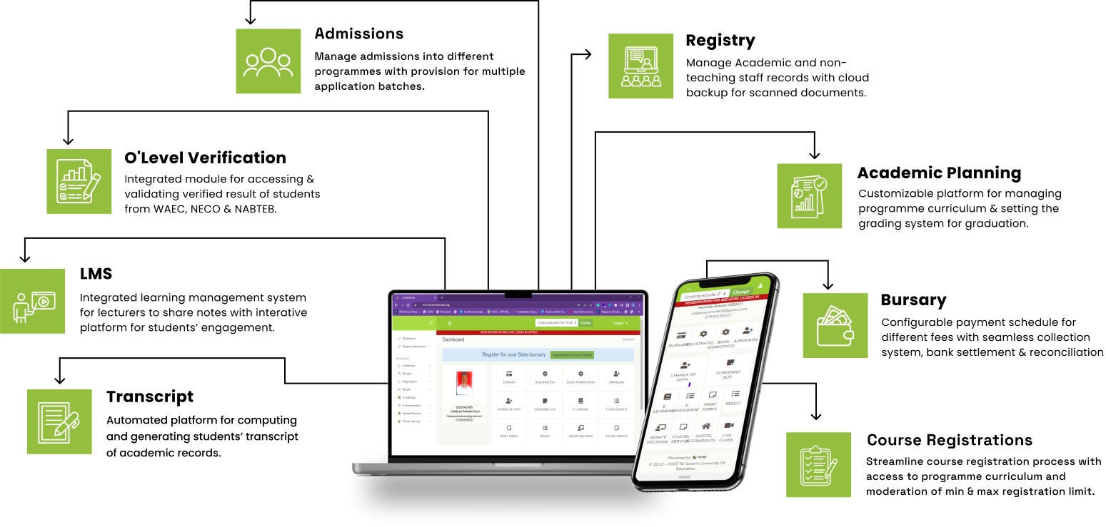 An integrated cloud platform for seamless processes in the management of admission, registration, learning, fees collection, and transcript processing in tertiary schools.